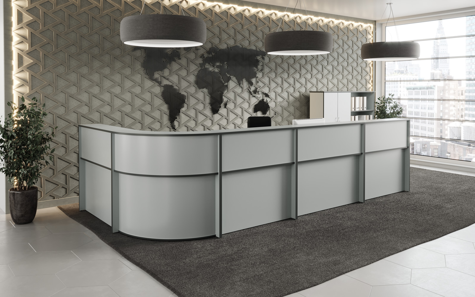 - Передние панели в угловых сегментах стойки администратора выполнены из HDF толщиной 3 мм, запрессованной в ПВХ-пленку цвета «серый металлик».