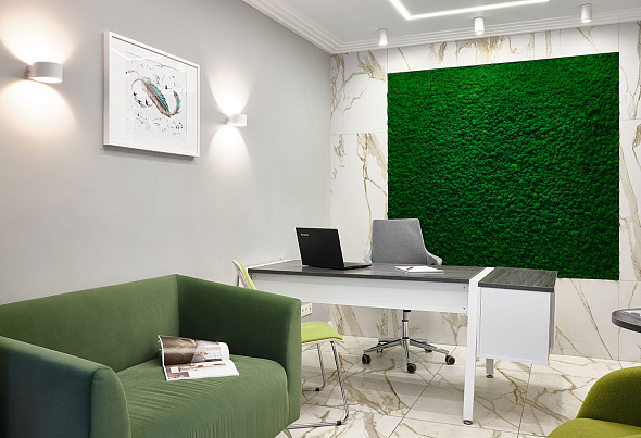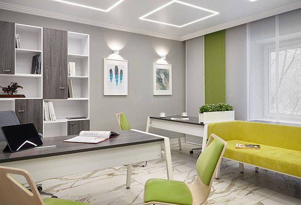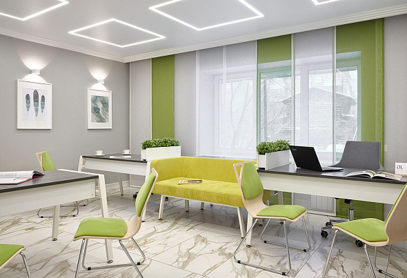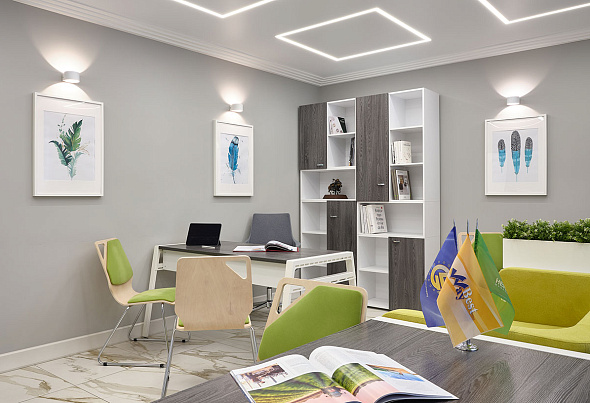По индивидуальному проекту оборудовали все кабинеты сотрудников и кабинет руководителя. Рабочие места для сотрудников выполнили единой рабочей станцией на базе серии «Air.Zone». Специально для проекта изготовили диваны из велюра зеленого цвета, дополнили креслами и стульями.