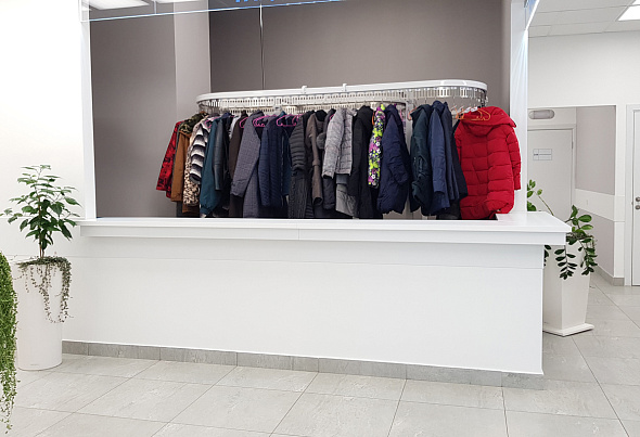На первом этаже клиники в регистратуре установлена нестандартная стойка ресепшен с подсветкой и стеллажная система для хранения документов. Здесь же, на первом этаже, установили стойку в гардеробной зоне, для которой изготовили столешницу нестандартных размеров, а также стойку и кухню для фитобара.